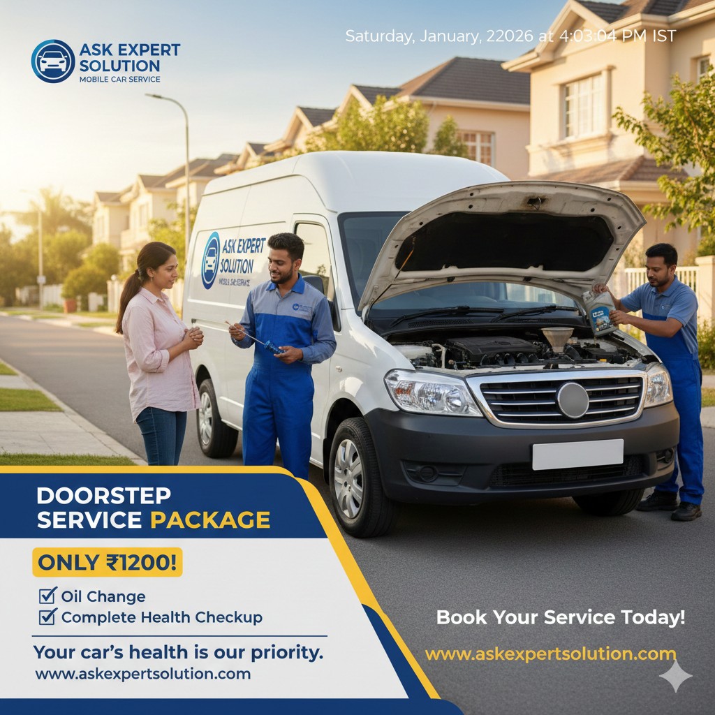 Ask Expert Solution: Expert Car Care, Right Where You Are! 🚗✨ Is your car giving you trouble? Too busy to visit the workshop? Ask Expert Solution brings the garage to your doorstep! Whether you are stuck on the road, at home, or at the office, our expert mechanics reach your location to provide top-notch service on the spot. Our Doorstep Service Package – Only ₹1200! We offer a comprehensive maintenance package at an unbeatable price. For a flat service fee of ₹1200, we provide: ✅ Oil Change: Ensuring your engine stays cool and runs smoothly. ✅ Filter Service: Cleaning or replacing filters for better fuel efficiency. ✅ Complete Health Checkup: A thorough inspection of your vehicle to ensure maximum safety and performance. Why Choose Ask Expert Solution? Ultimate Convenience: No more towing or waiting in long service center queues. We come to you! Transparent Pricing: High-quality service at a fixed, affordable labor cost. Expert Mechanics: Your car is in the hands of skilled professi